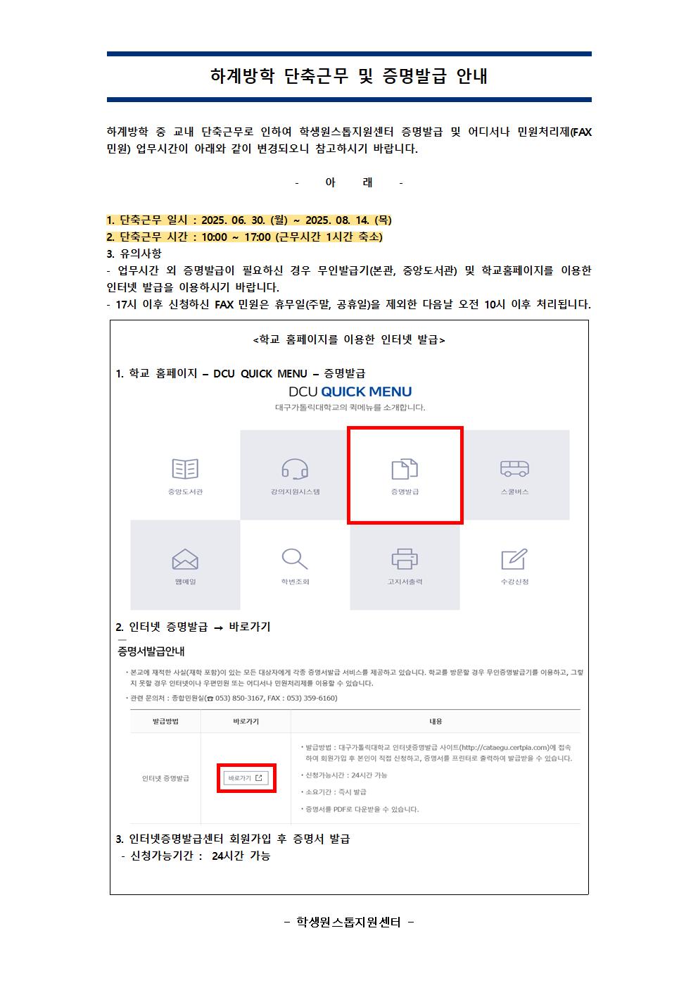 하계방학 단축근무 및 증명발급 안내