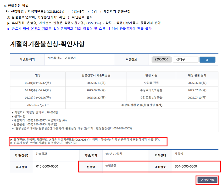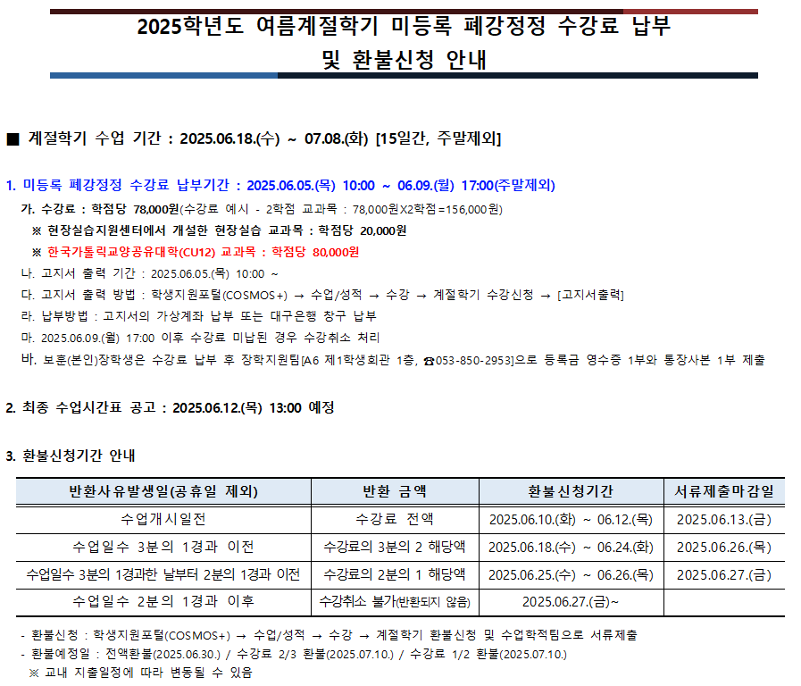 2025학년도 여름계절학기 미등록 폐강정정 수강료 납부 및 환불신청 안내