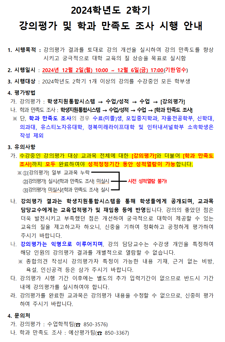 2024학년도 2학기 강의평가 및 학과만족도 조사 실시 안내