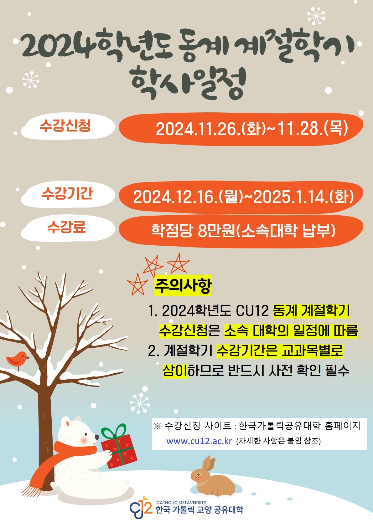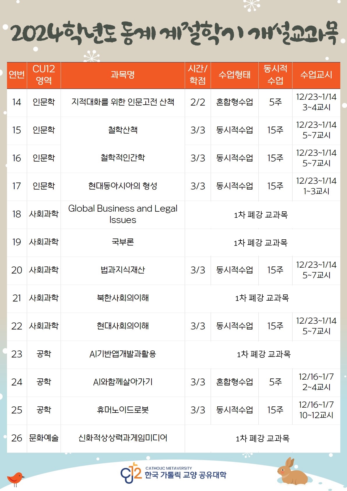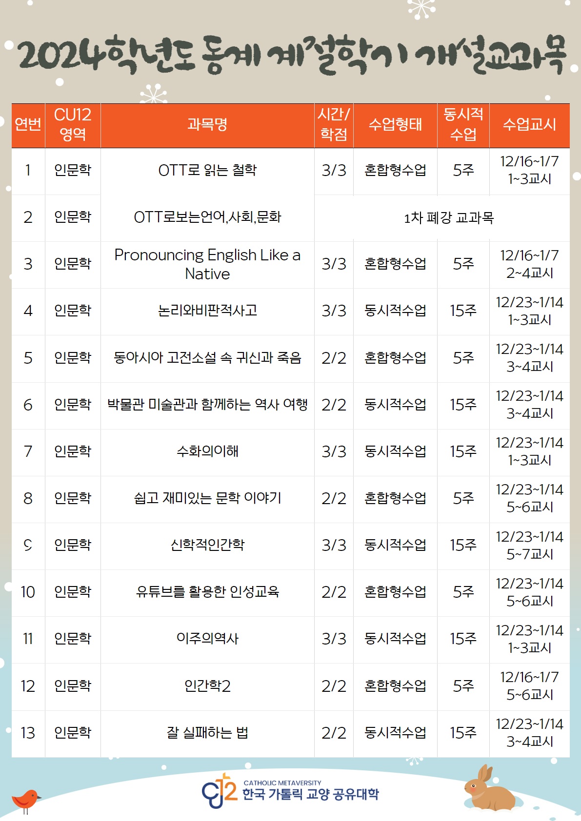 한국 가톨릭 교양 공유대학(CU12) 동계계절학기 신청 안내