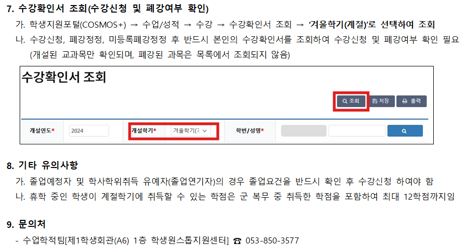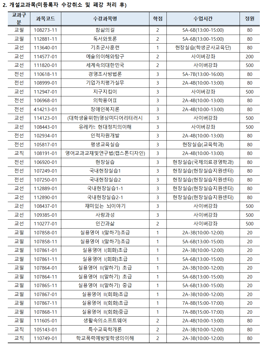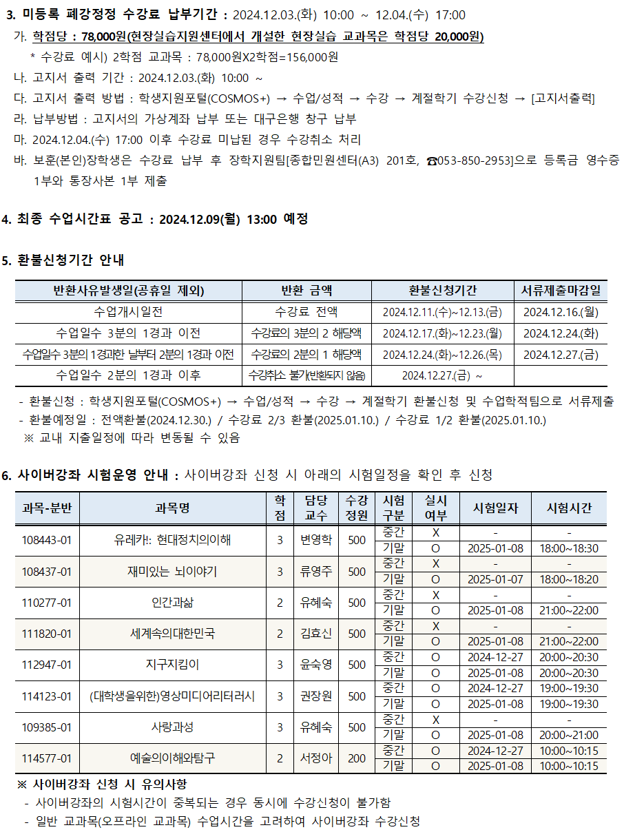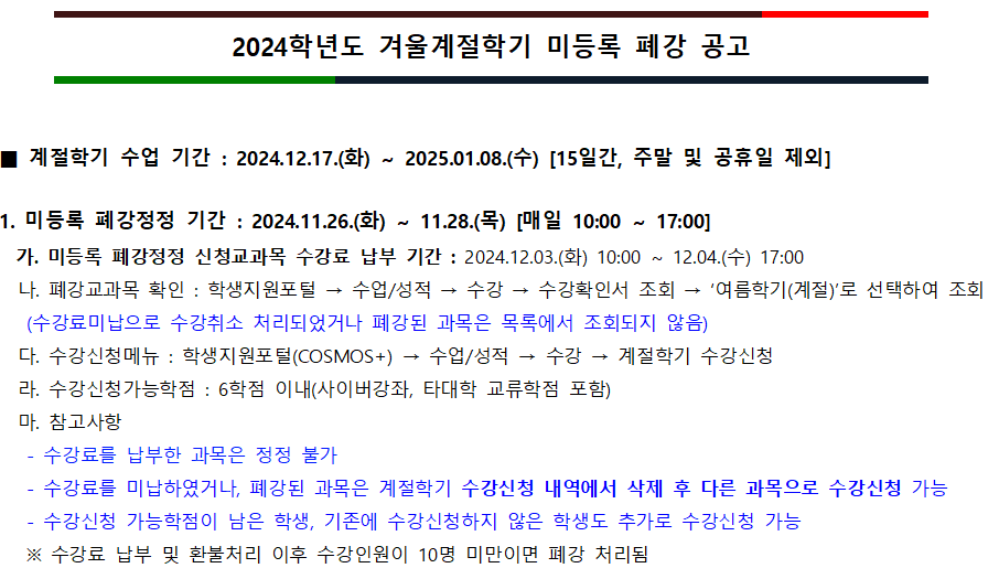 2024학년도 겨울계절학기 미등록 폐강 공고