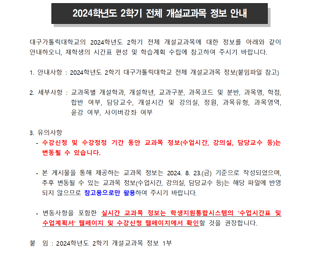 2024학년도 2학기 전체 개설교과목 정보 안내