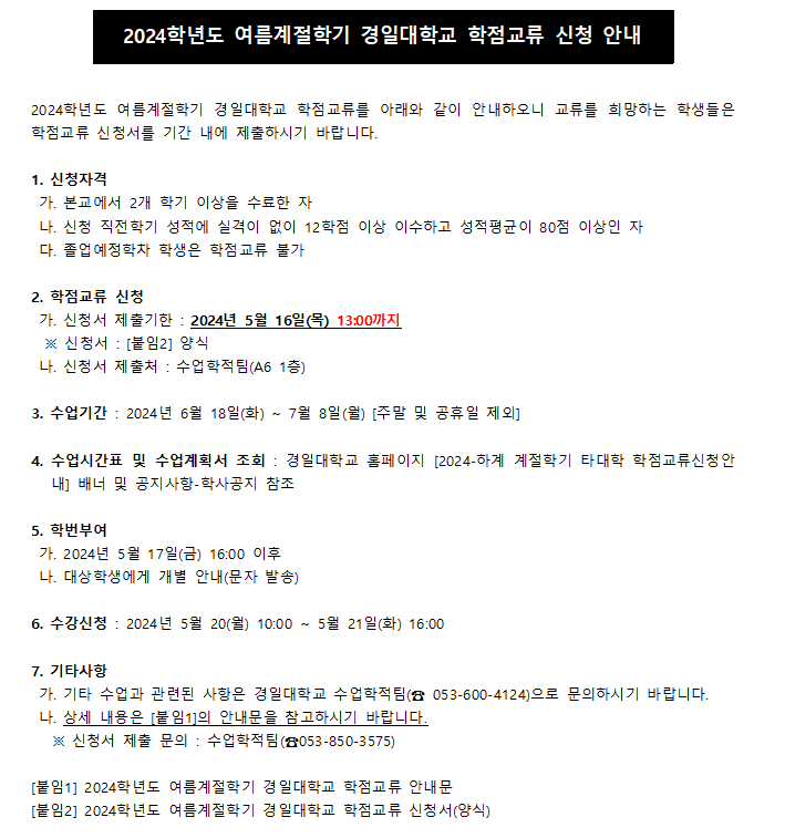 2024학년도 여름 계절학기 경일대학교 학점교류 신청 안내