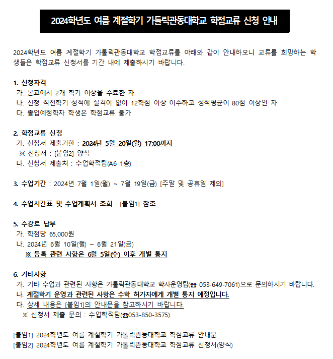 2024학년도 여름 계절학기 가톨릭관동대학교 학점교류 신청 안내