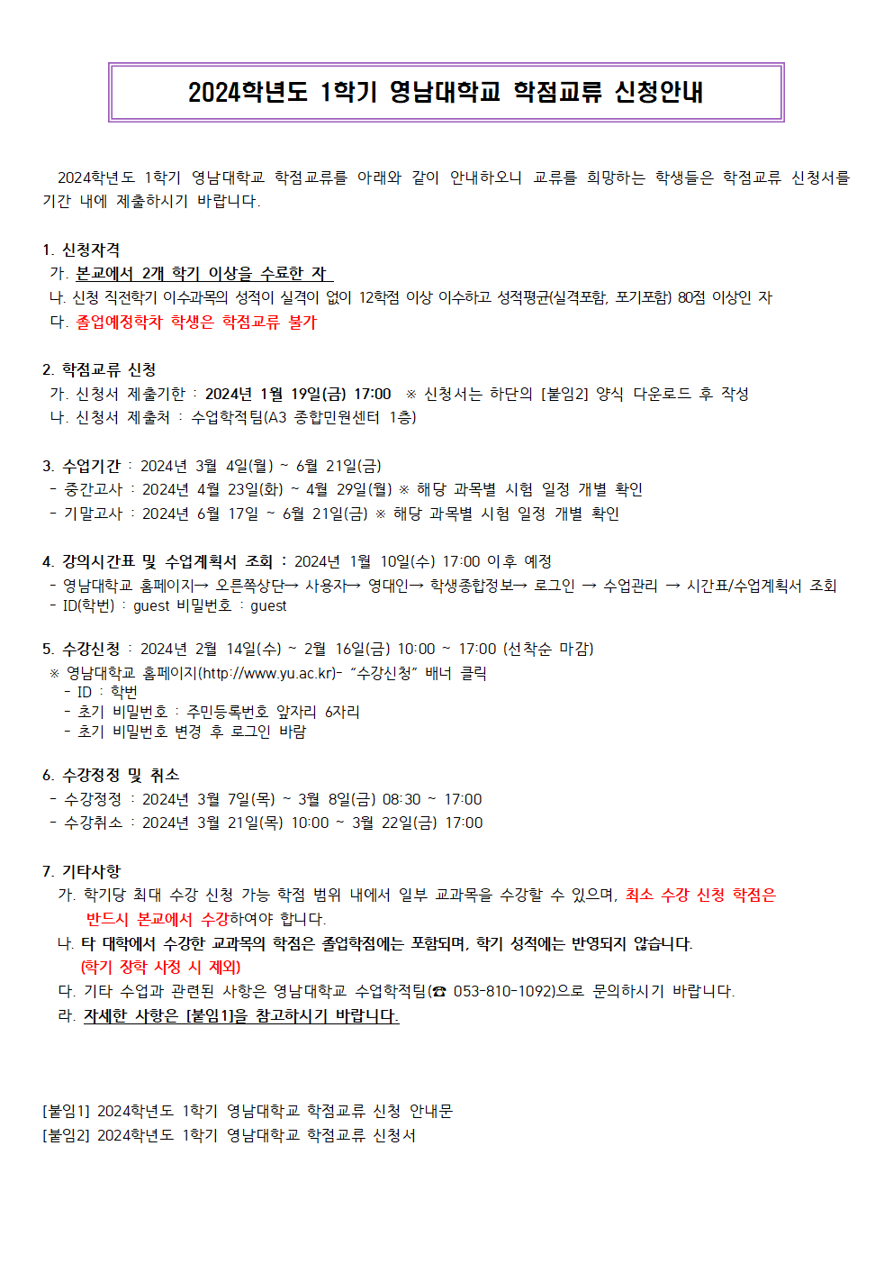 [첨부] [붙임1] 2024학년도 1학기 영남대학교 학점교류 신청 안내문.hwp
