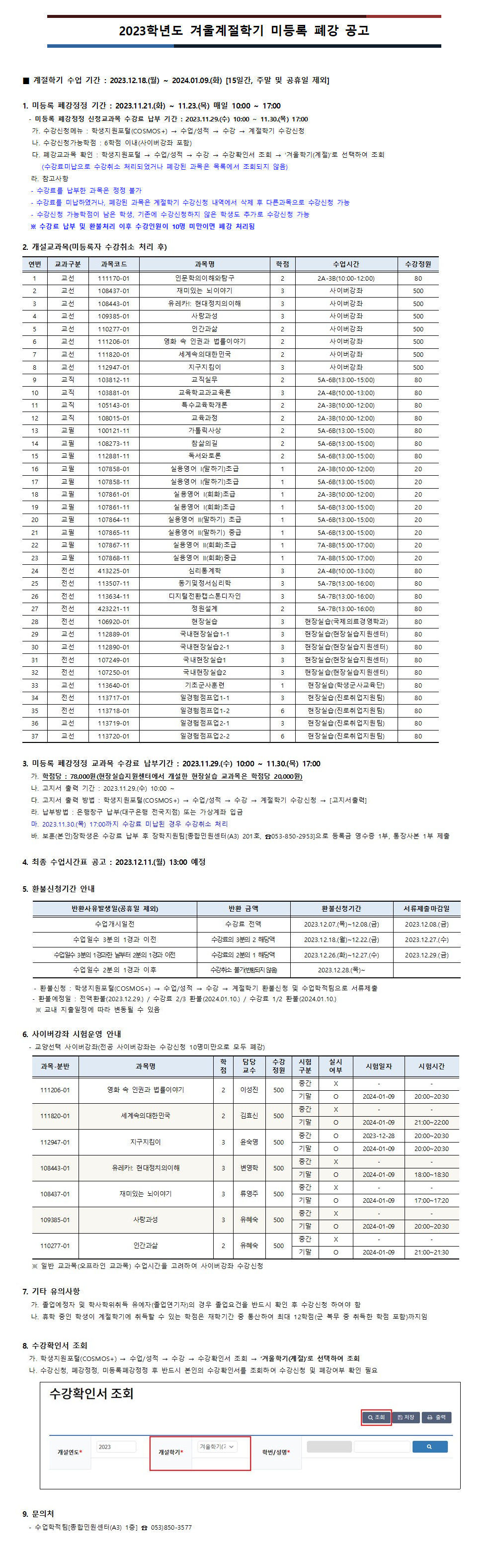 2023학년도 겨울계절학기 미등록 폐강 공고