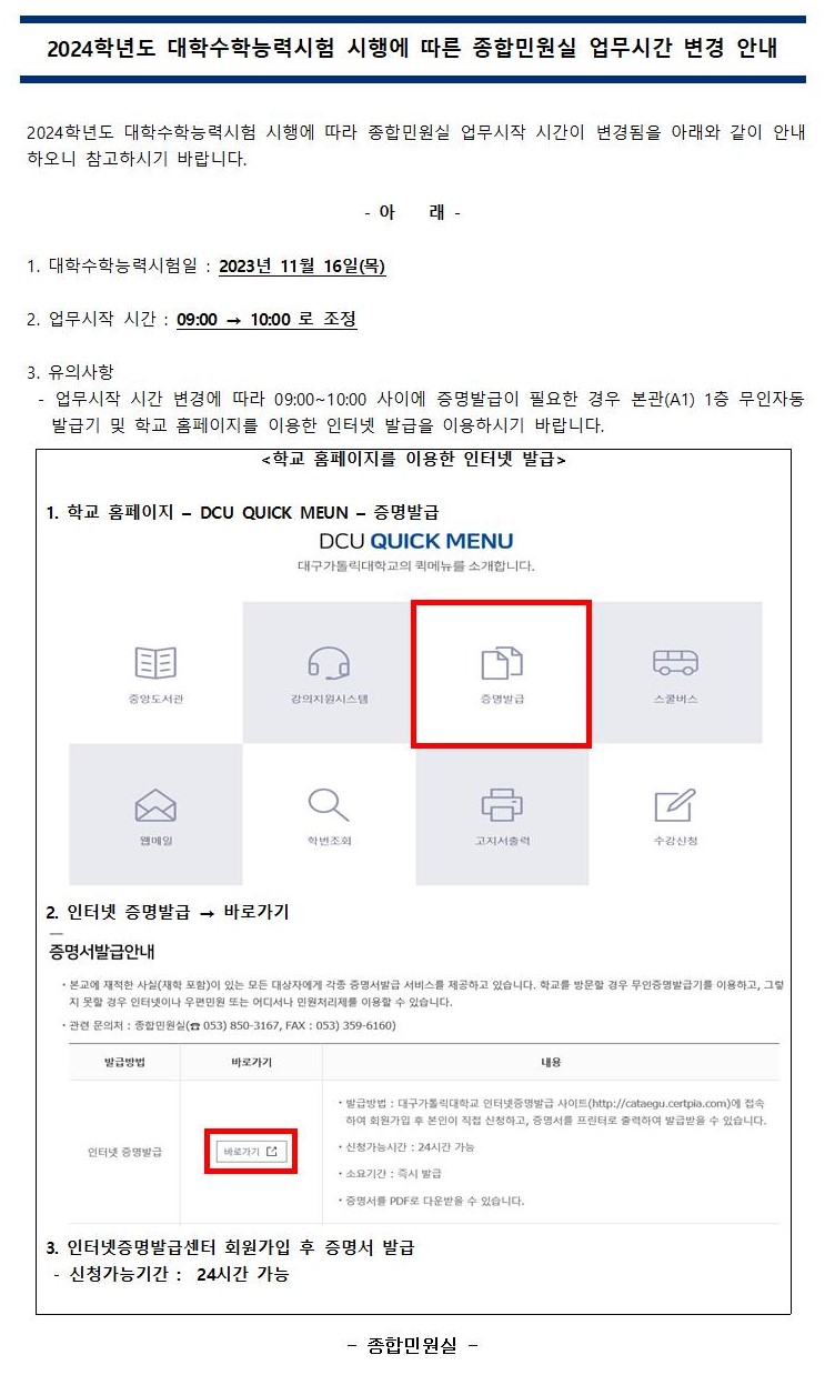 2024학년도 대학수학능력시험 시행에 따른 종합민원실 업무시간 변경 안내