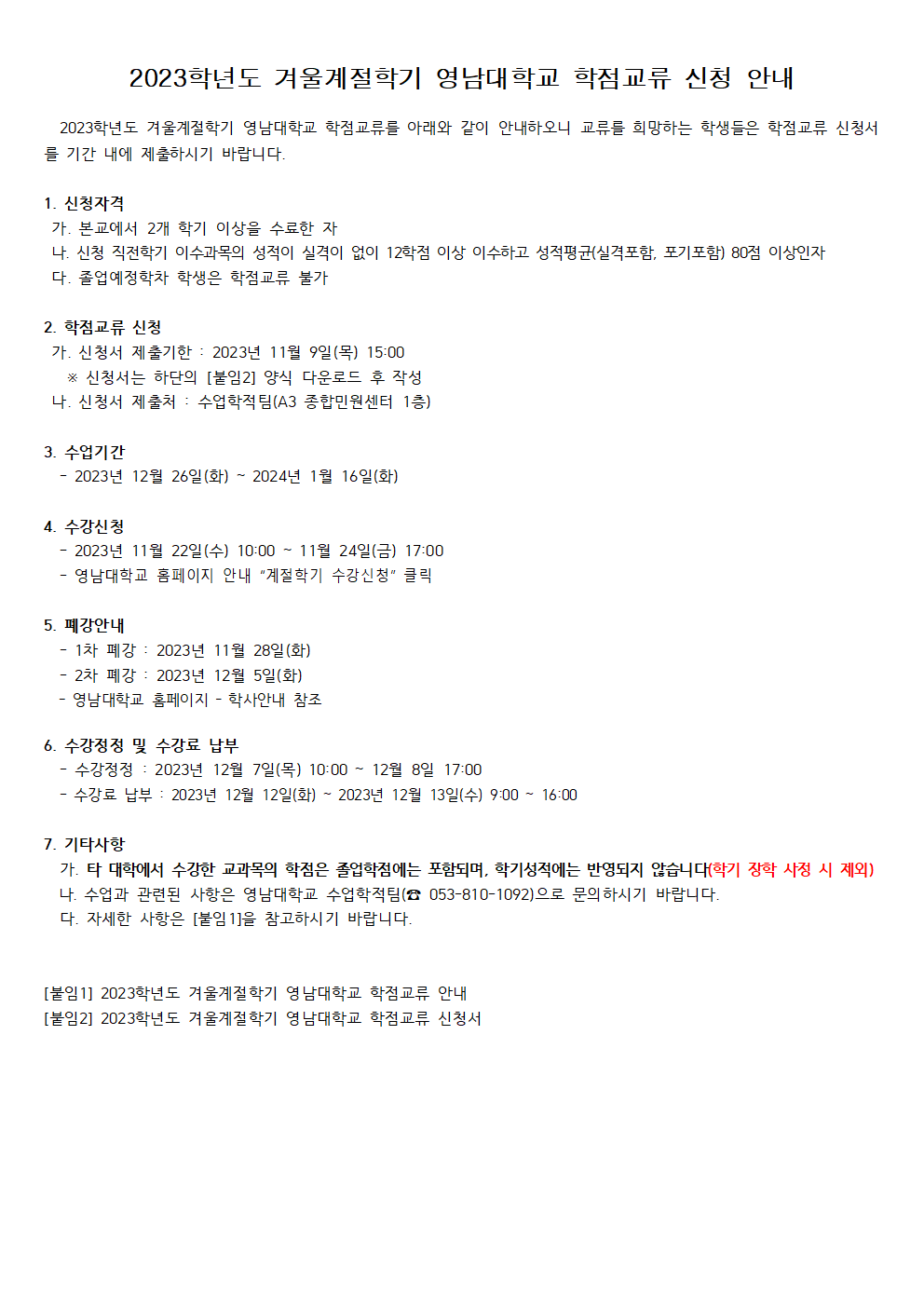 2023학년도 겨울계절학기 영남대학교 학점교류 신청 안내
