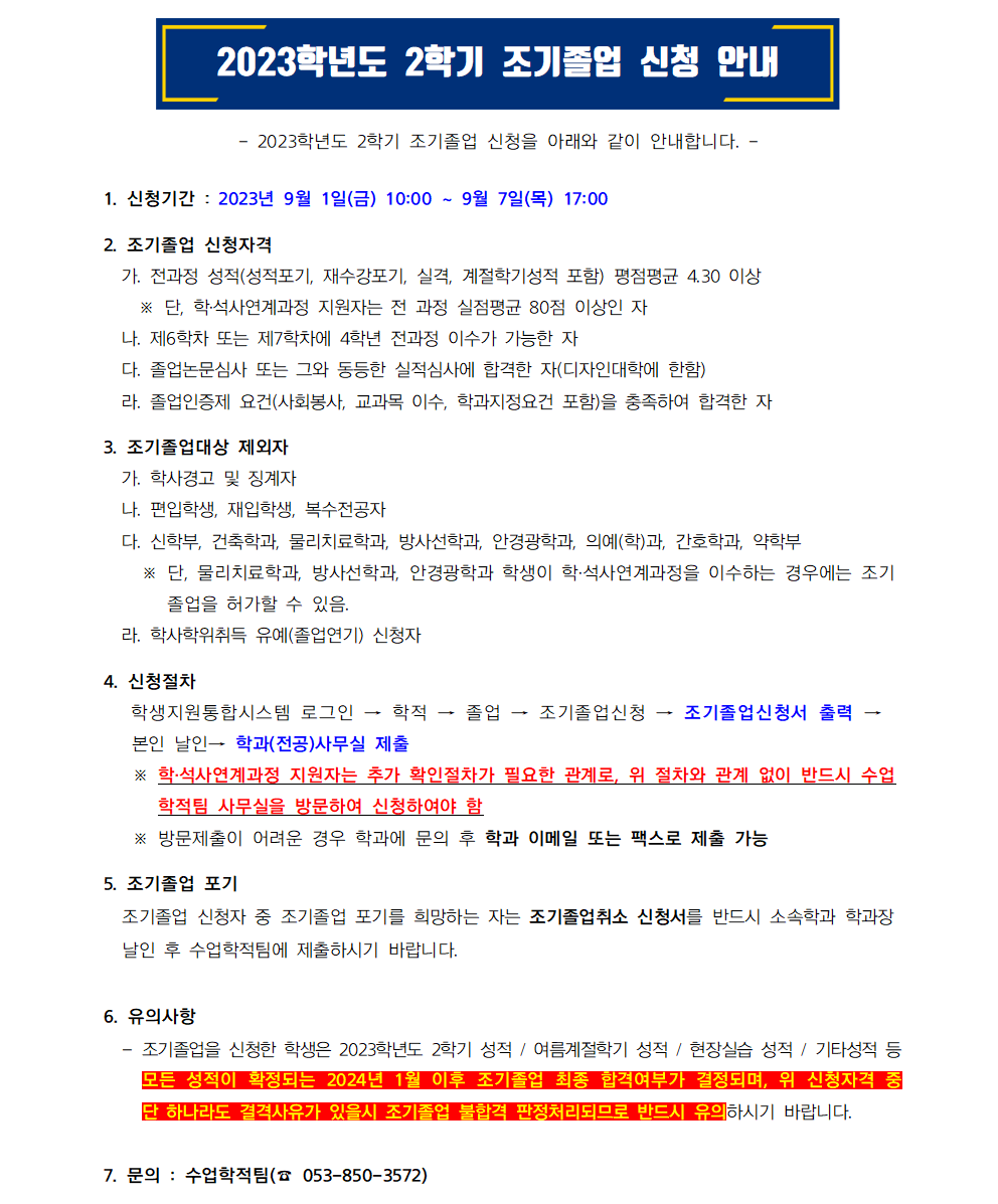 2023학년도 2학기 조기졸업 신청 안내