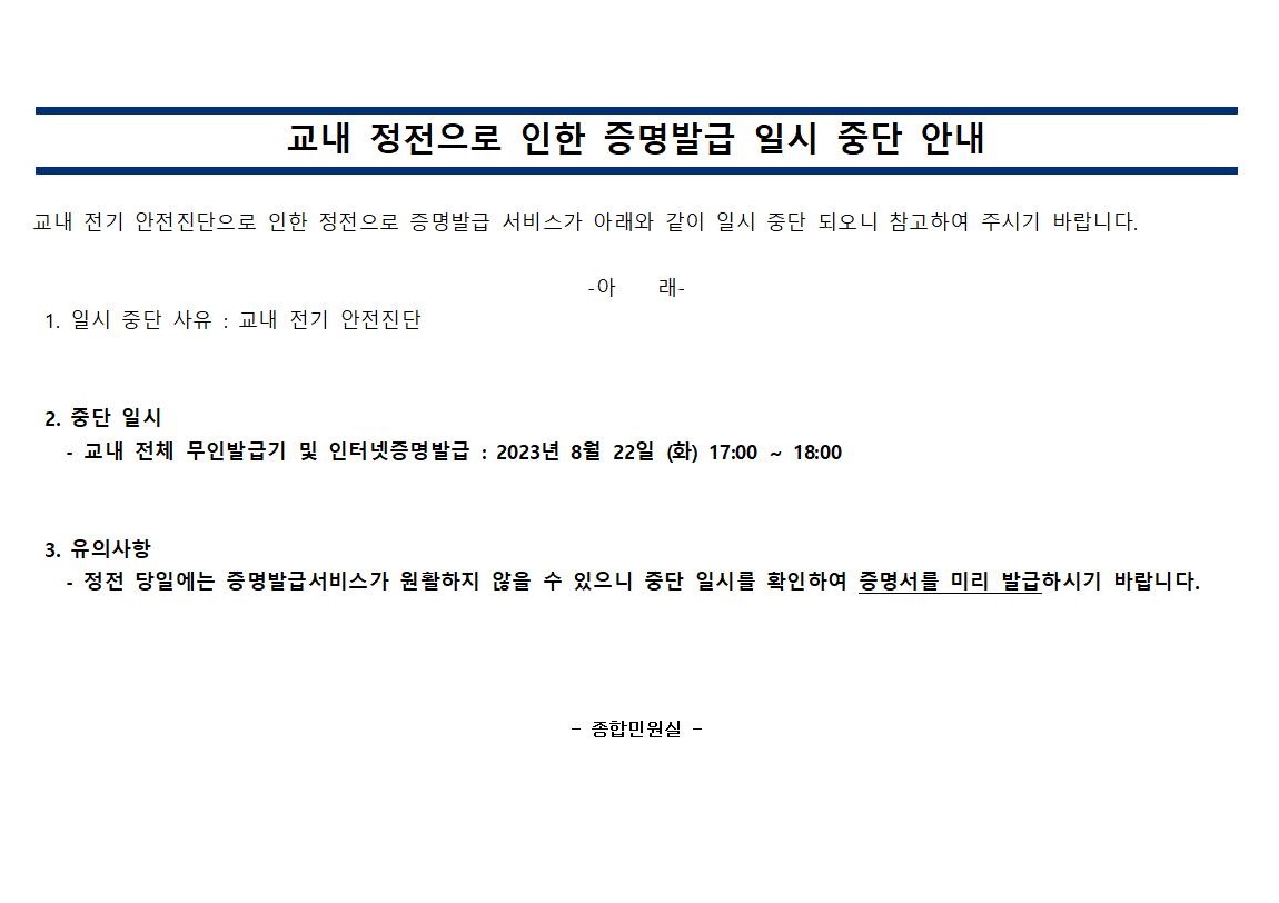 교내 정전으로 인한 증명발급 일시 중단 안내