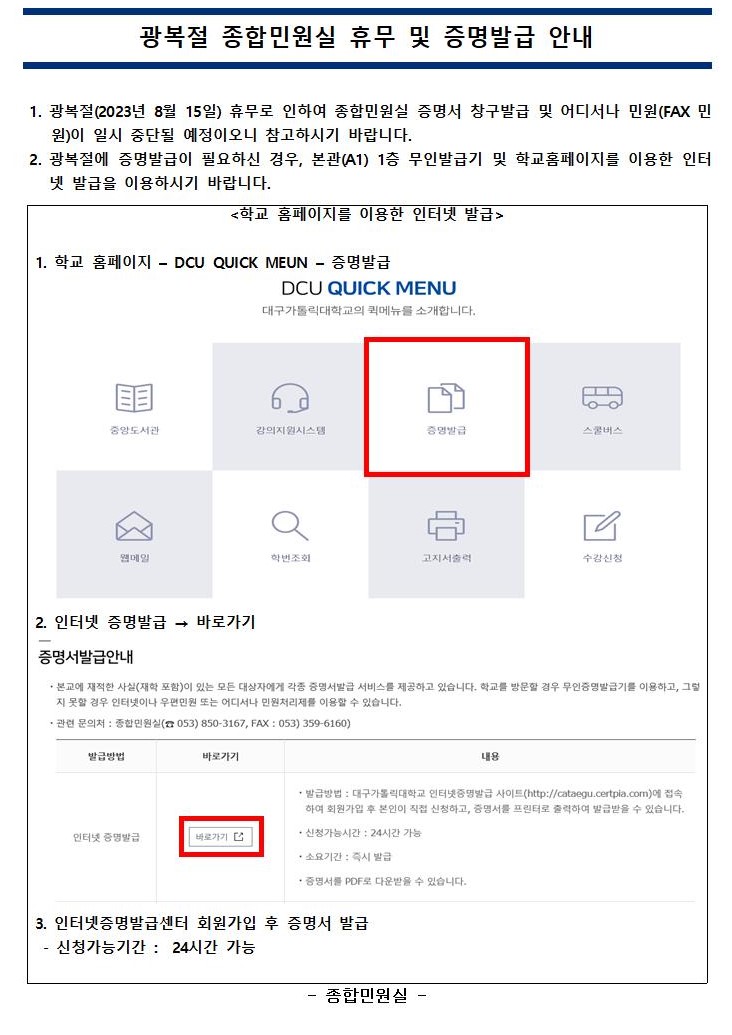 공휴일(광복절) 종합민원실 휴뮤 및 증명발급 안내