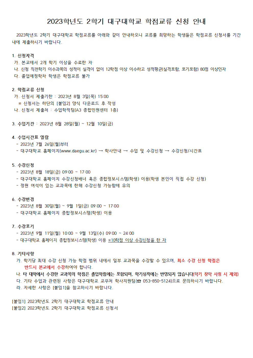 [첨부] [붙임1] 2023학년도 2학기 대구대학교 학점교류 안내.hwp
