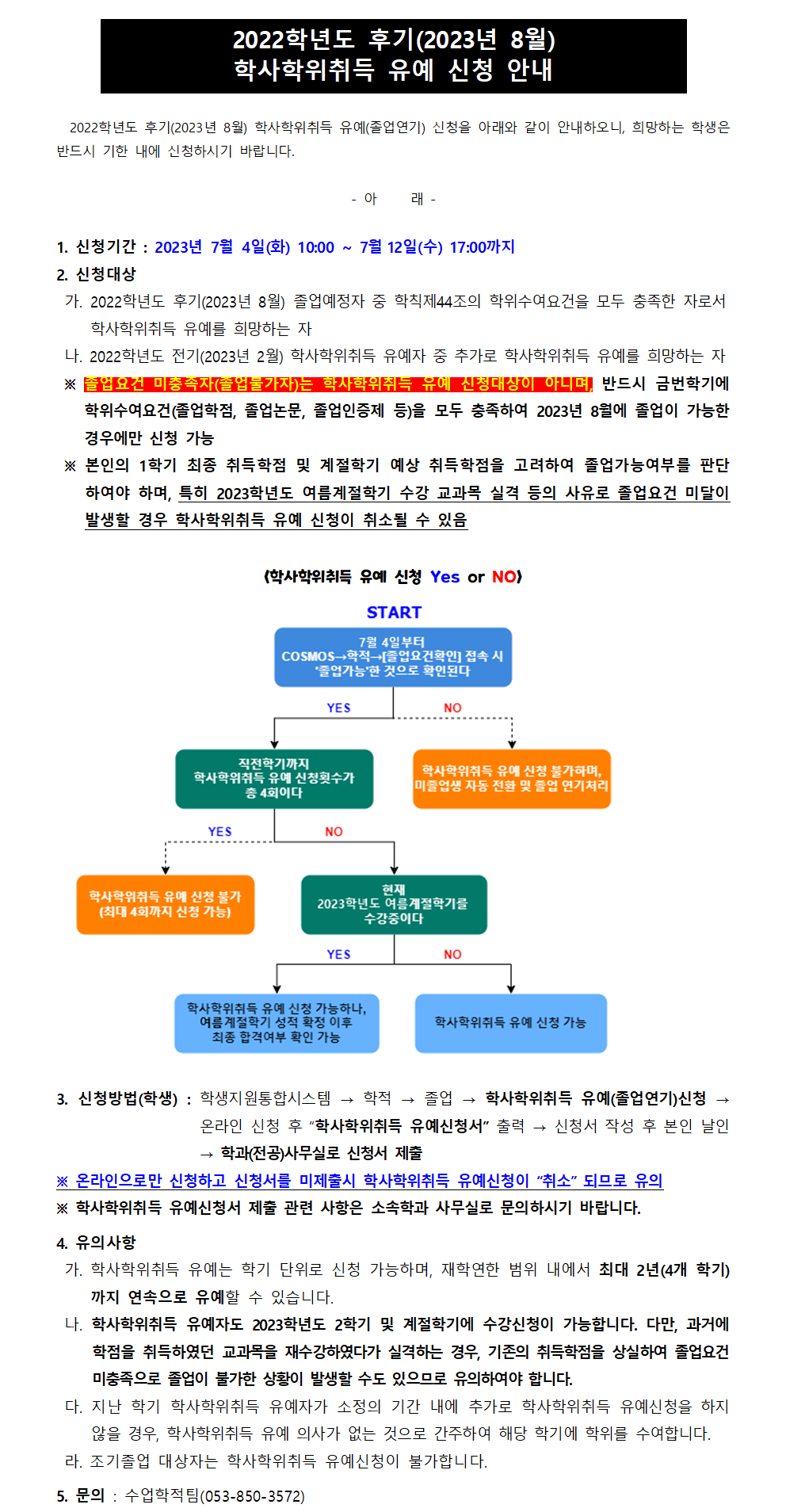 2022학년도 후기(2023년 8월) 학사학위취득 유예 신청 안내