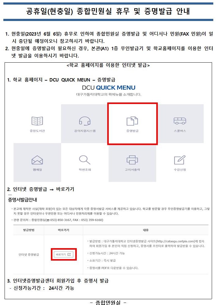 공휴일(현충일) 종합민원실 휴무 및 증명발급 안내