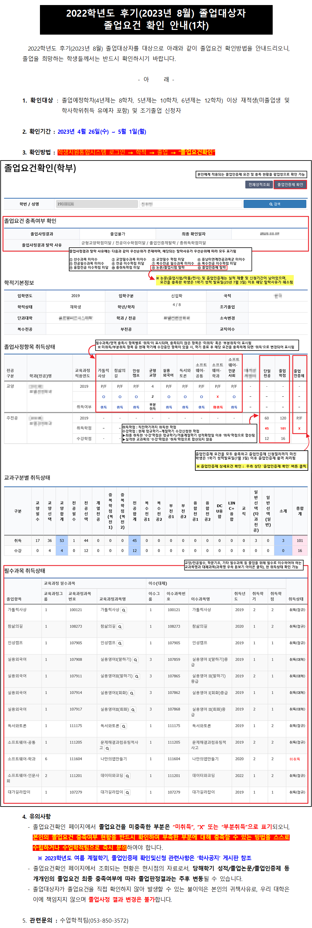 2022학년도 후기(2023년 8월) 졸업대상자 졸업요건 확인 안내(1차)