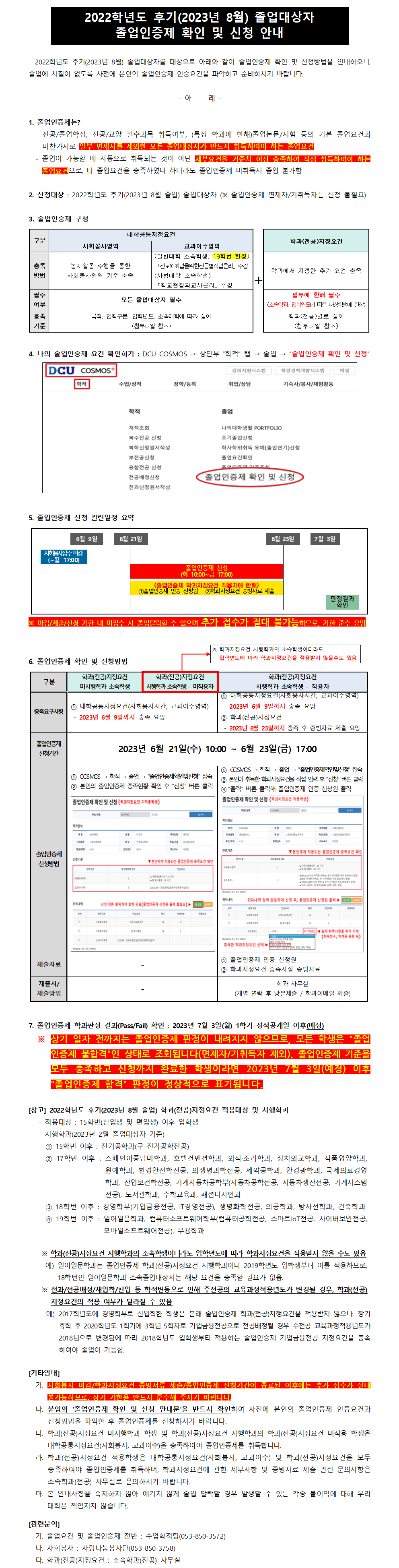 2022학년도 후기(2023년 8월) 졸업인증제 확인및신청 안내