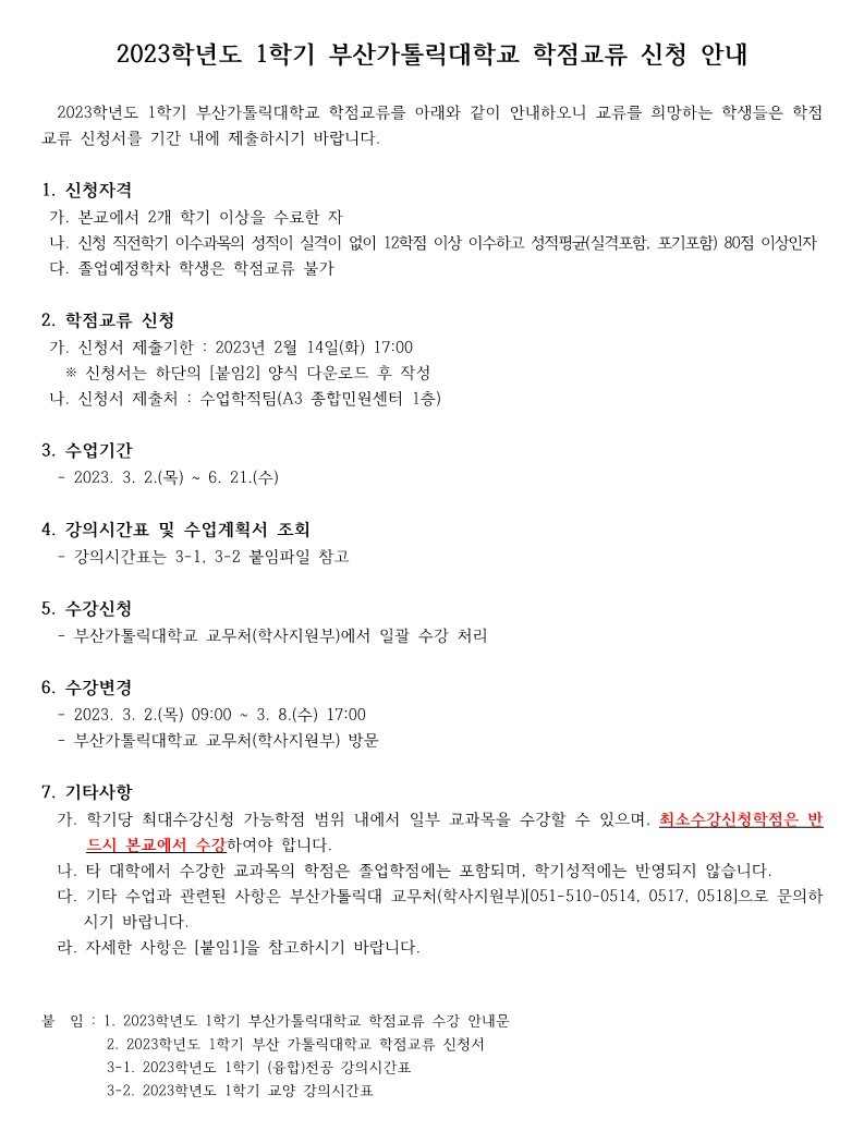 [첨부] [붙임1] 2023학년도 1학기 부산가톨릭대학교 학점교류 수강 안내문.hwp