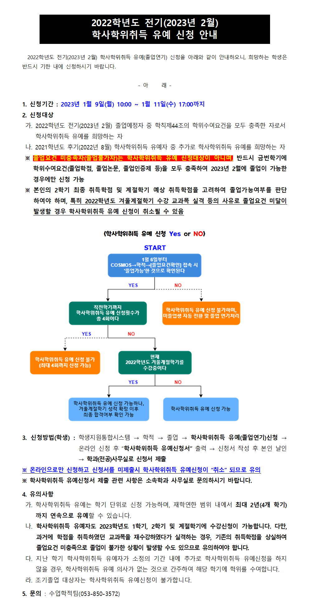 2022학년도 전기(2023년 2월) 학사학위취득 유예 신청 안내