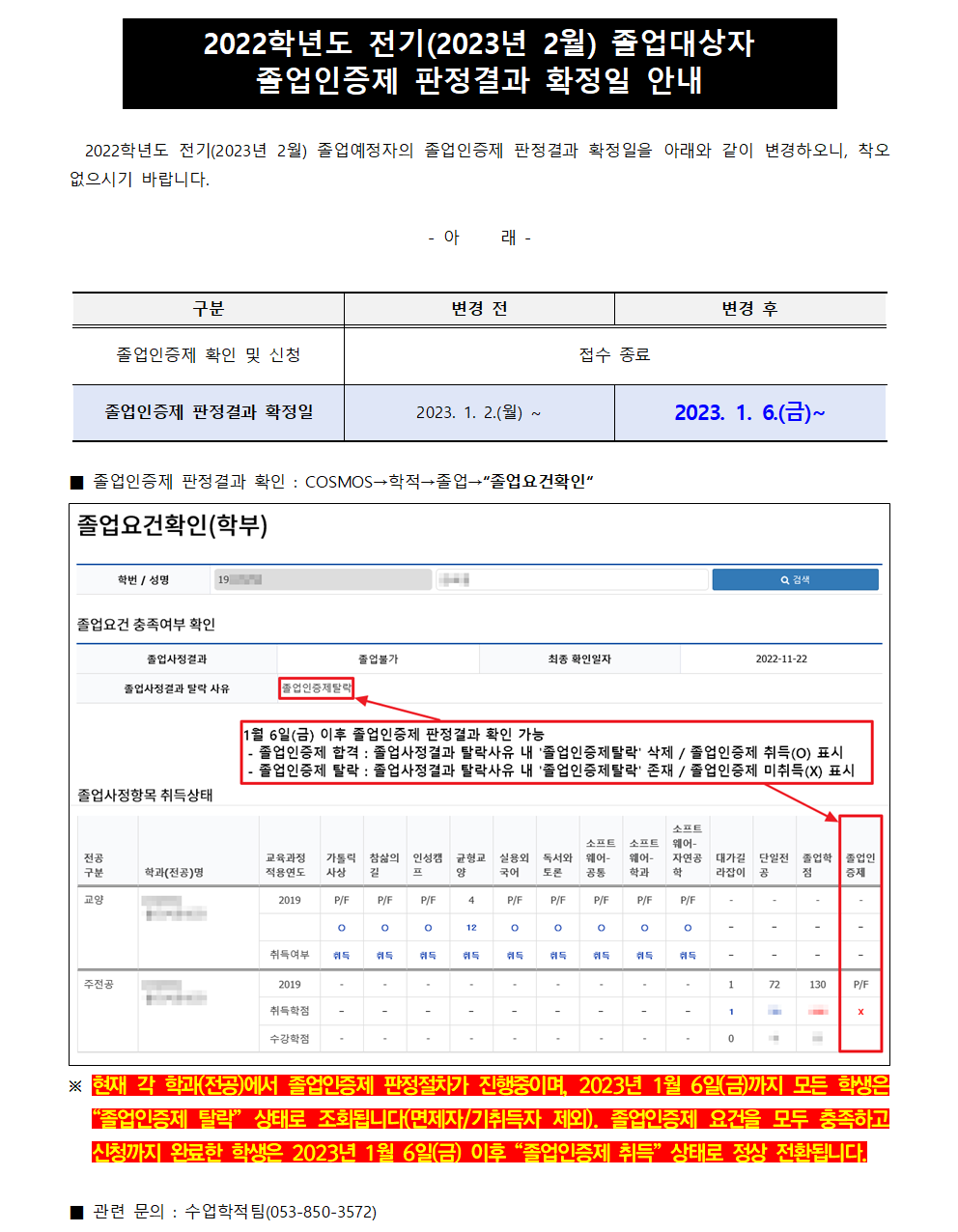 2022학년도 전기(2023년 2월) 졸업인증제 판정결과 확정일 안내