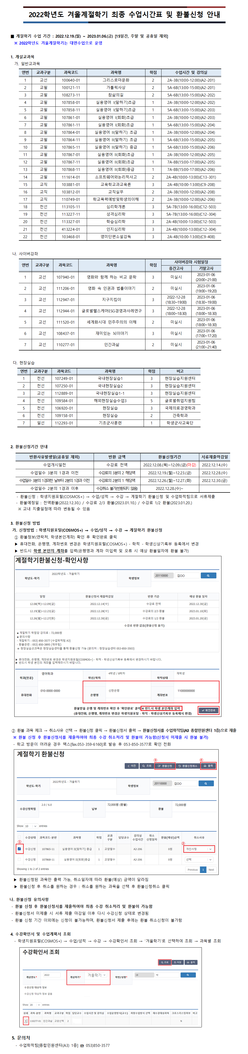 2022학년도 겨울계절학기 최종 수업시간표 및 환불신청 안내