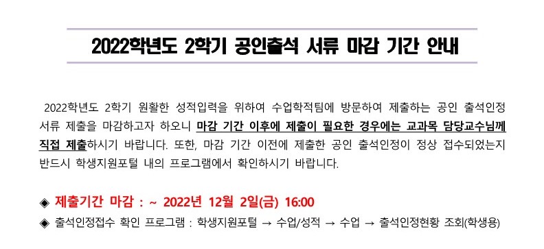 2022학년도 2학기 공인출석 서류 마감 기간 안내
