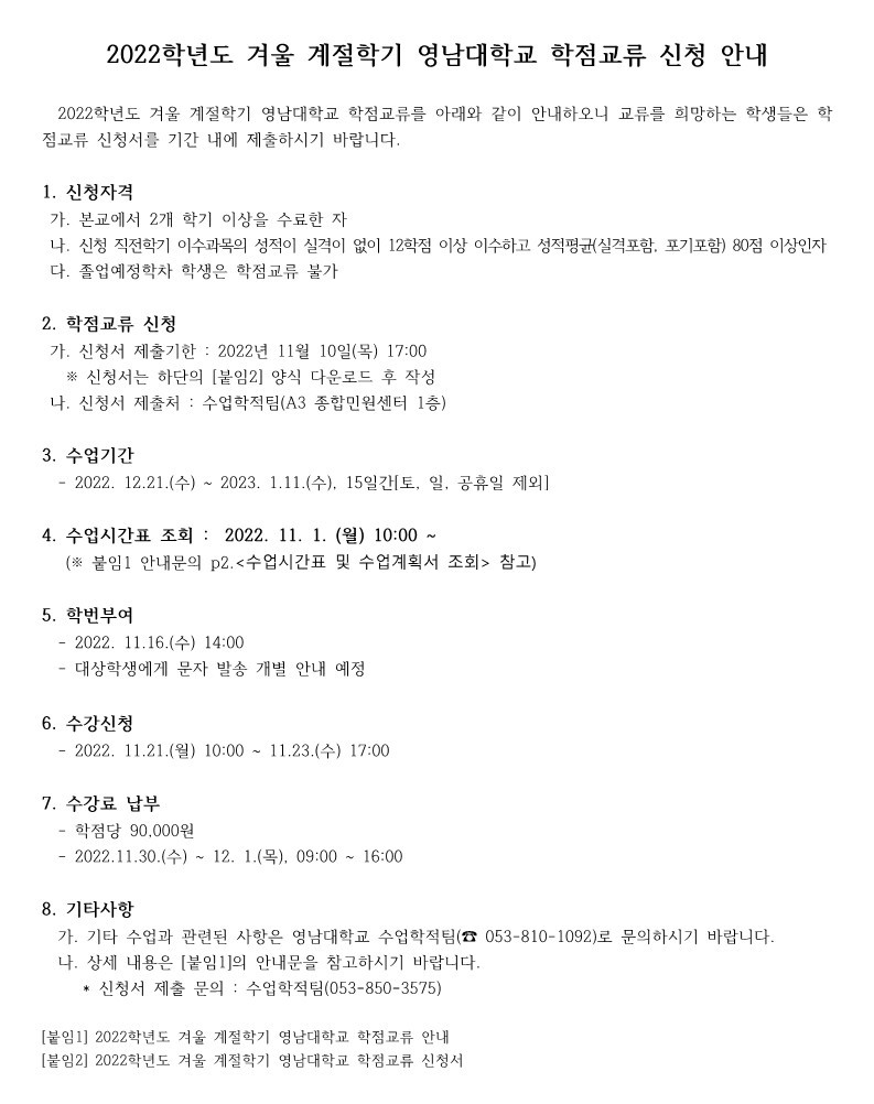 [첨부] [붙임1] 2022학년도 겨울 계절학기 영남대학교 학점교류 안내.hwp
