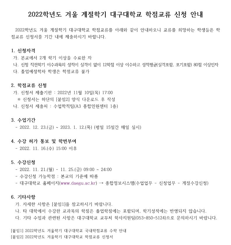 2022학년도 겨울학기 대구대학교 학점교류 신청 안내