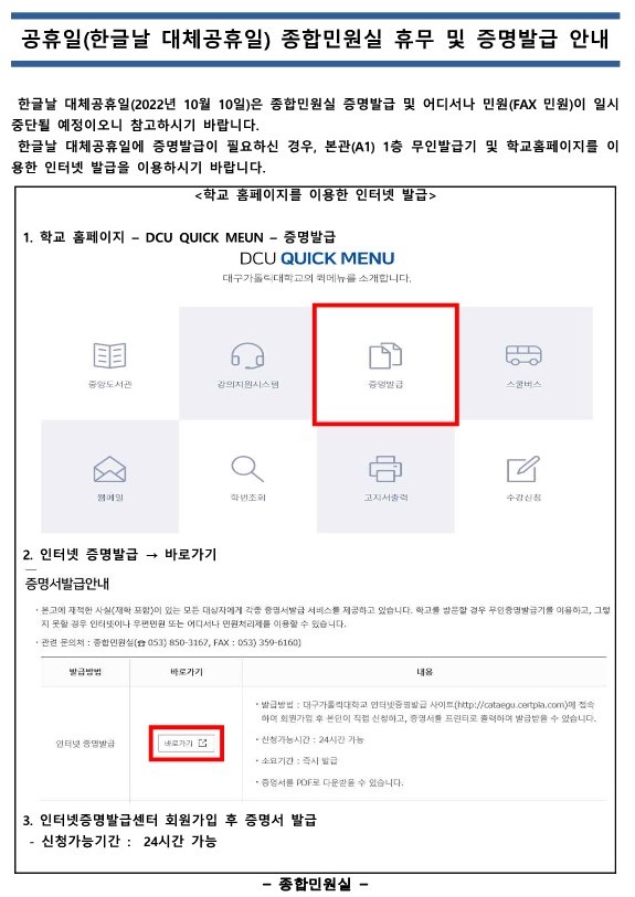 공휴일(한글날 대체공휴일) 종합민원실 휴무 및 증명발급 안내