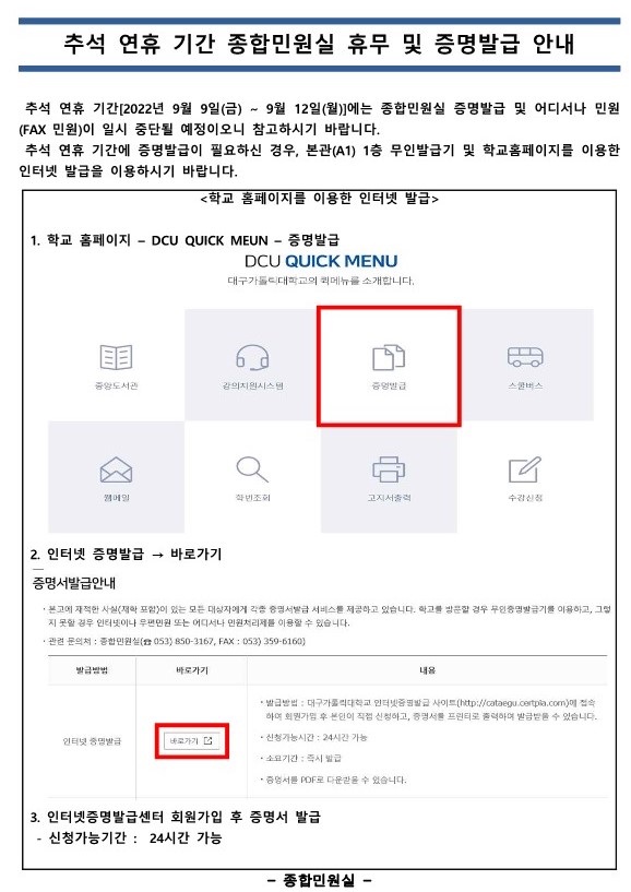 추석 연휴 기간 종합민원실 휴무 및 증명발급 안내
