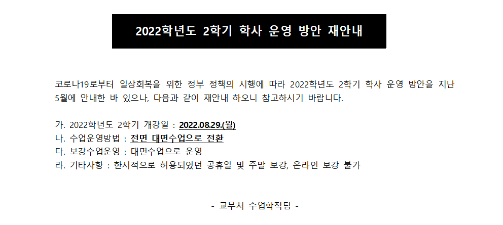 2022학년도 2학기 학사 운영 방안 재안내
