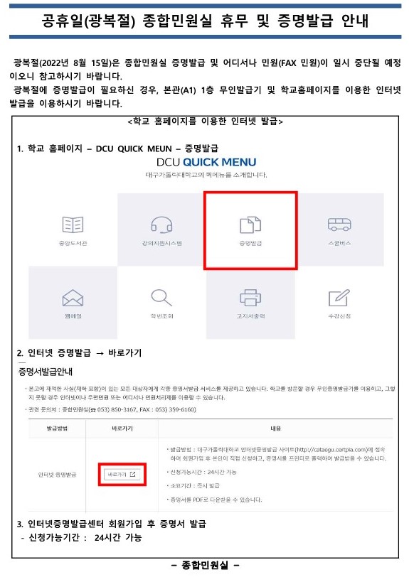 공휴일(광복절) 종합민원실 휴무 및 증명발급 안내