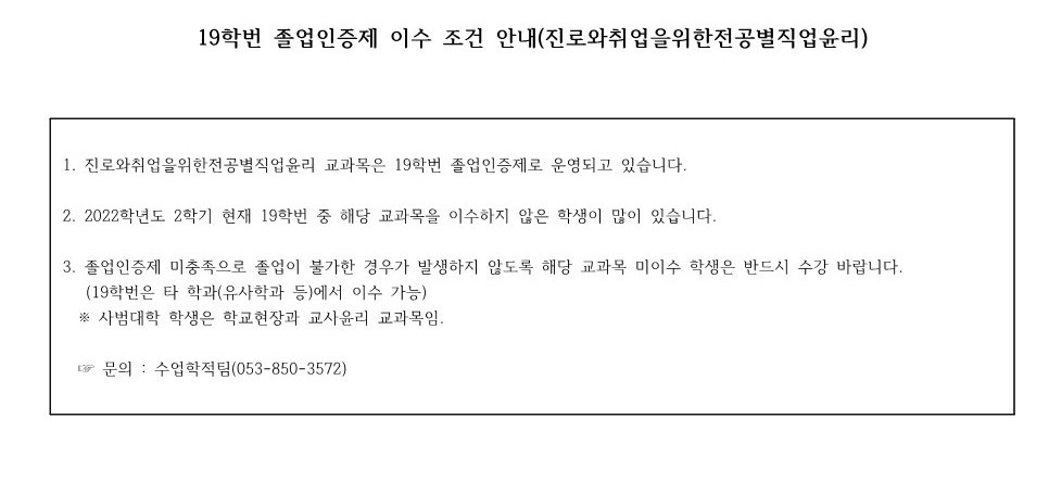 19학번 졸업인증제 이수 조건 안내(진로와취업을위한전공별직업윤리)
