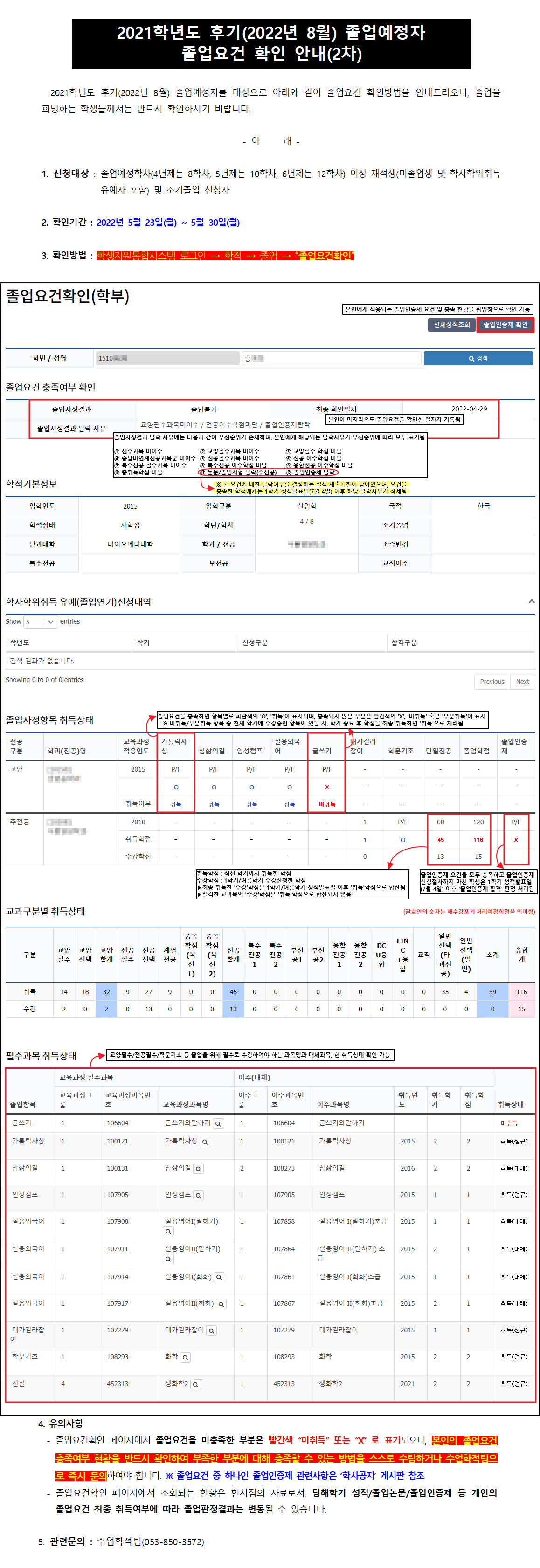 2021학년도 후기(2022년 8월) 졸업예정자 졸업요건 확인 안내(2차)