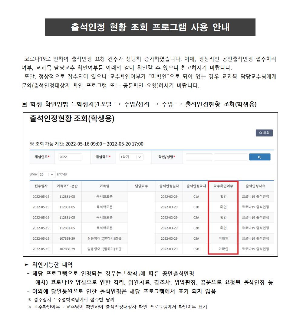 출석인정 현황 조회 프로그램 사용 안내
