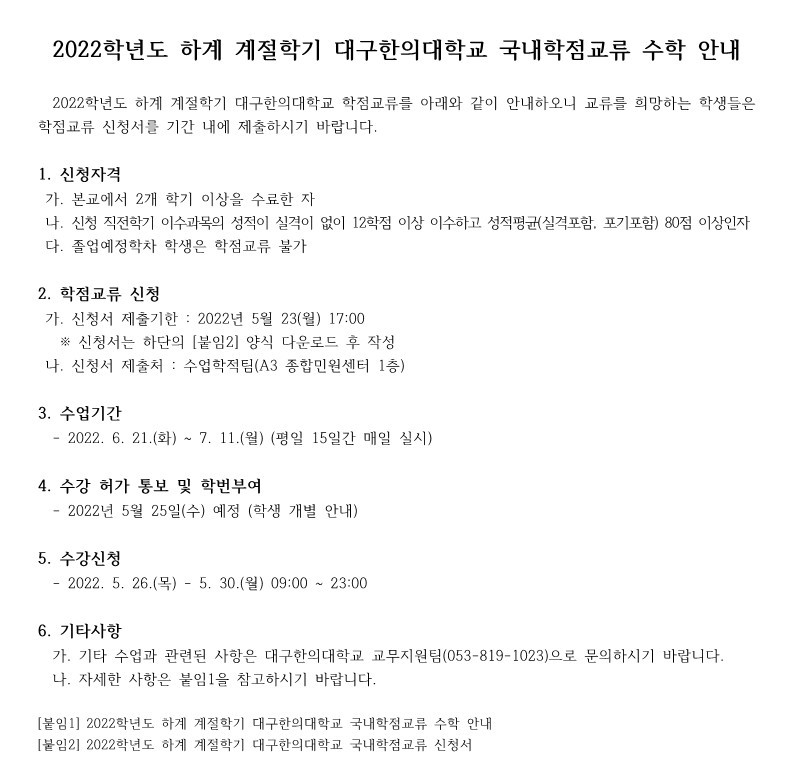 2022학년도 하계 계절학기 대구한의대학교 학점교류 신청 안내