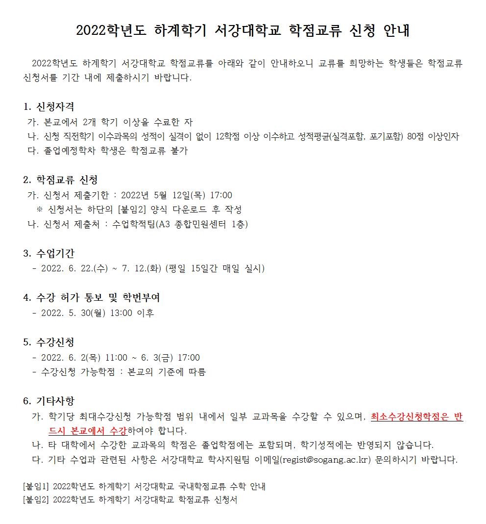 2022학년도 하계학기 서강대학교 학점교류 신청 안내