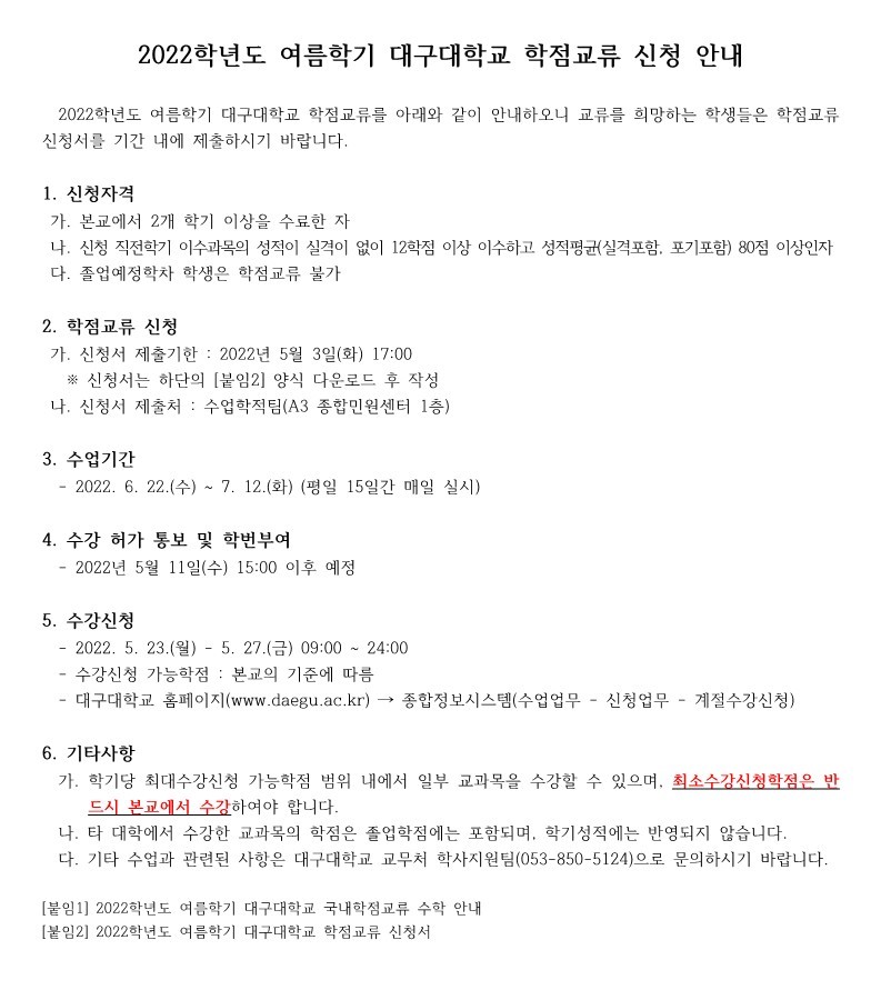 [첨부] [붙임1] 2022학년도 여름학기 대구대학교 국내학점교류 수학 안내.hwp
