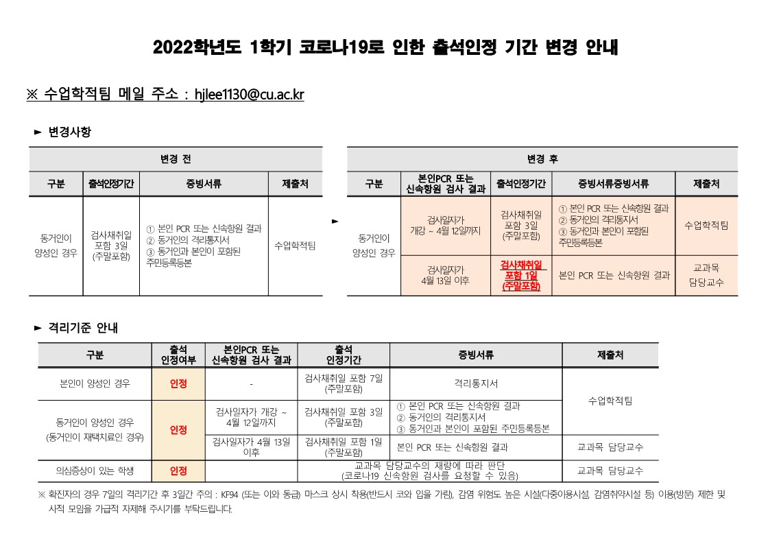 2022학년도 1학기 코로나19로 인한 출석인정 기간 변경 안내