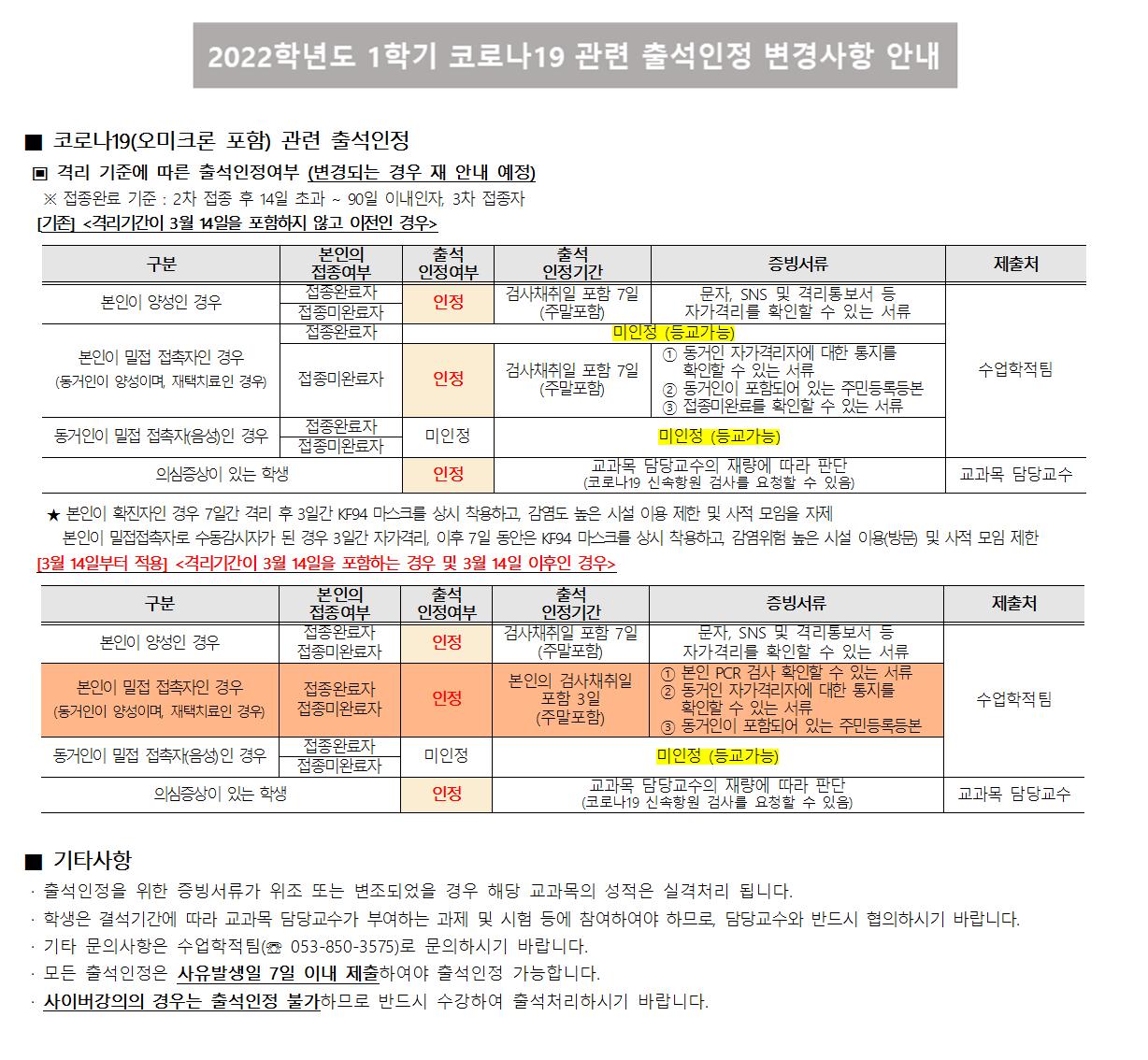 2022학년도 1학기 코로나19 관련 출석인정 변경사항 안내