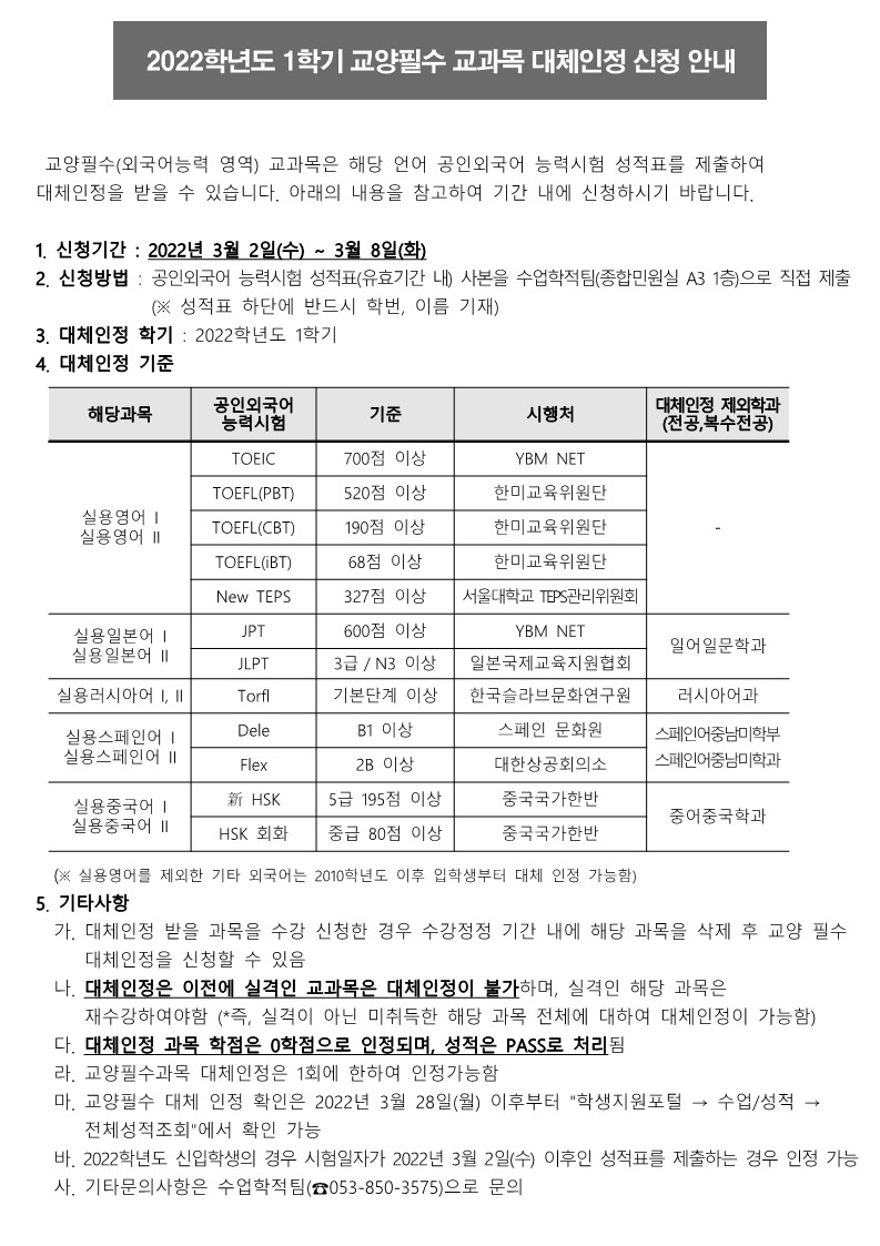 2022학년도 1학기 교양필수 교과목 대체인정 신청 안내