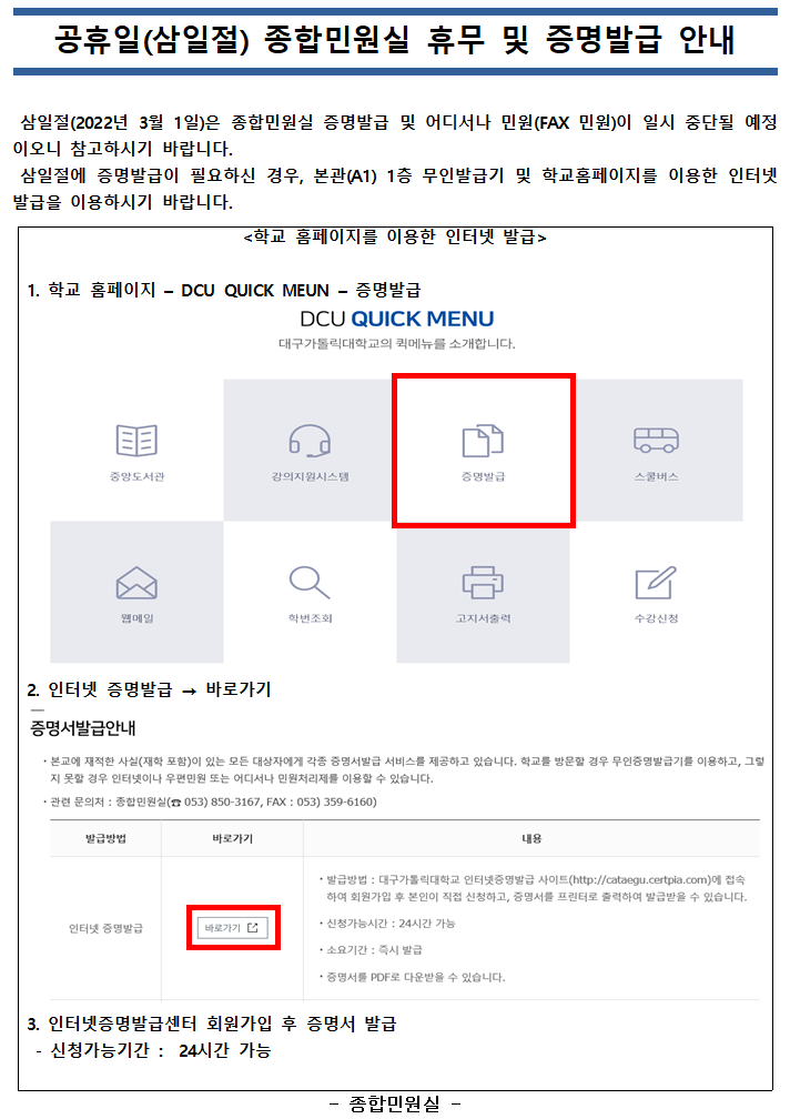 공휴일(삼일절) 종합민원실 휴무 및 증명발급 안내