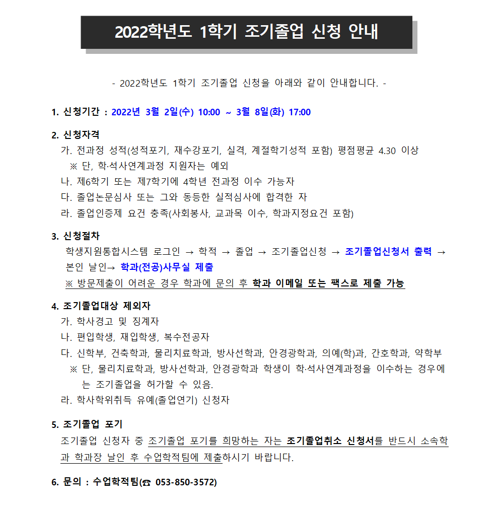2022학년도 1학기 조기졸업 신청 안내