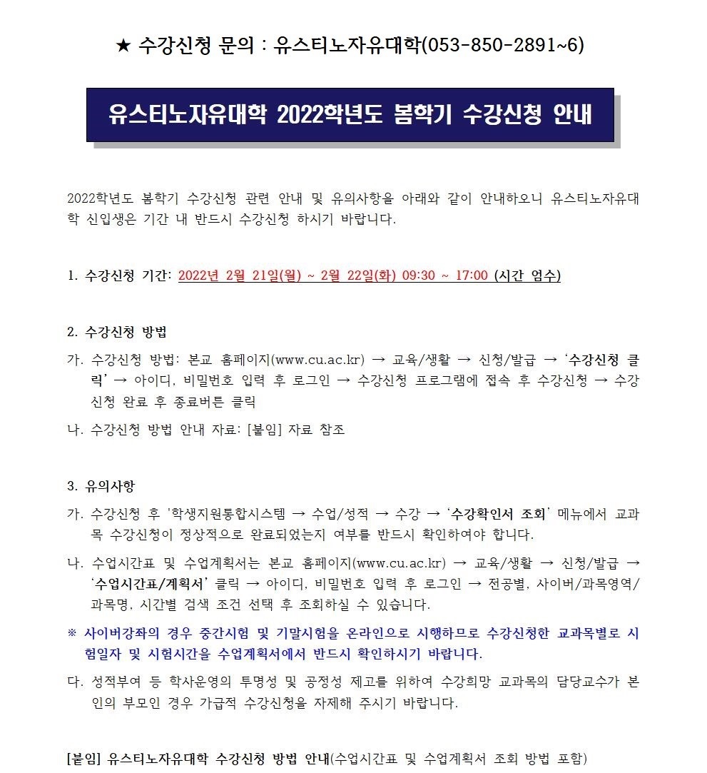유스티노자유대학 2022학년도 봄학기 수강신청 안내