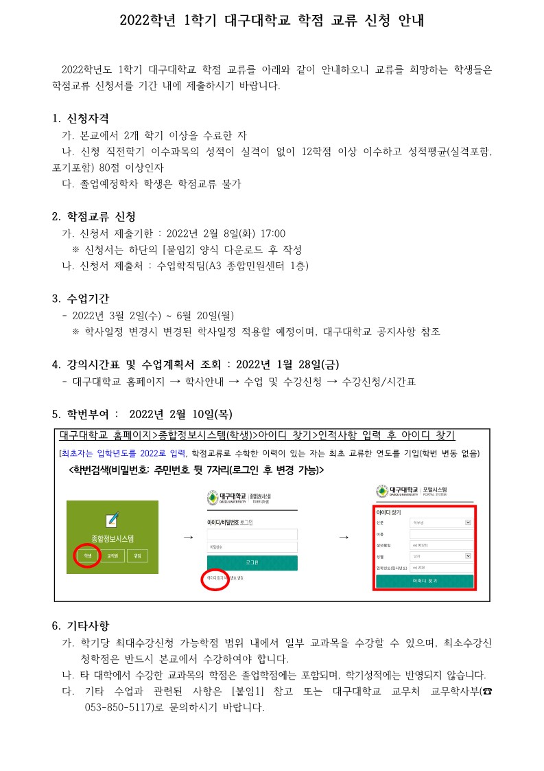 2022학년 1학기 대구대학교 학점 교류 신청 안내