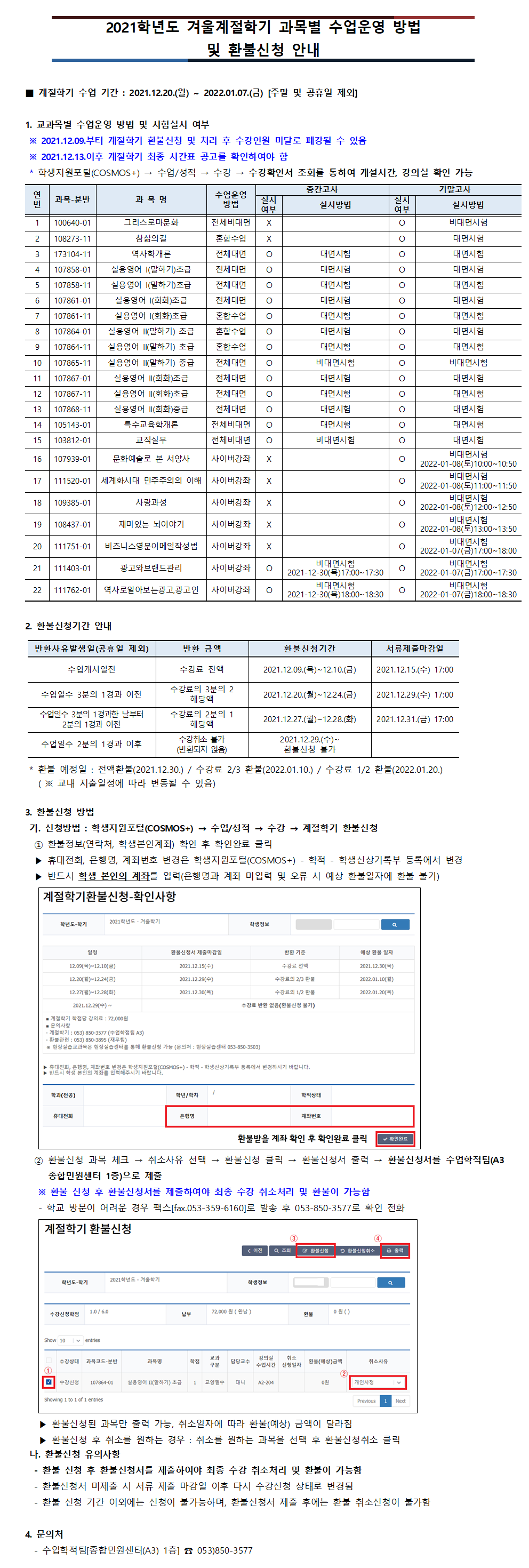 2021학년도 겨울계절학기 과목별 수업운영 방법 및 환불신청 안내