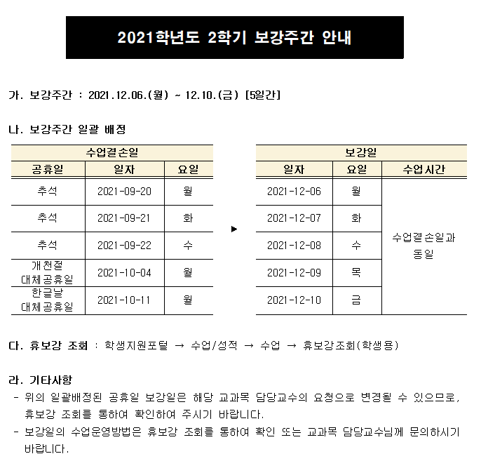 2021학년도 2학기 보강주간 안내