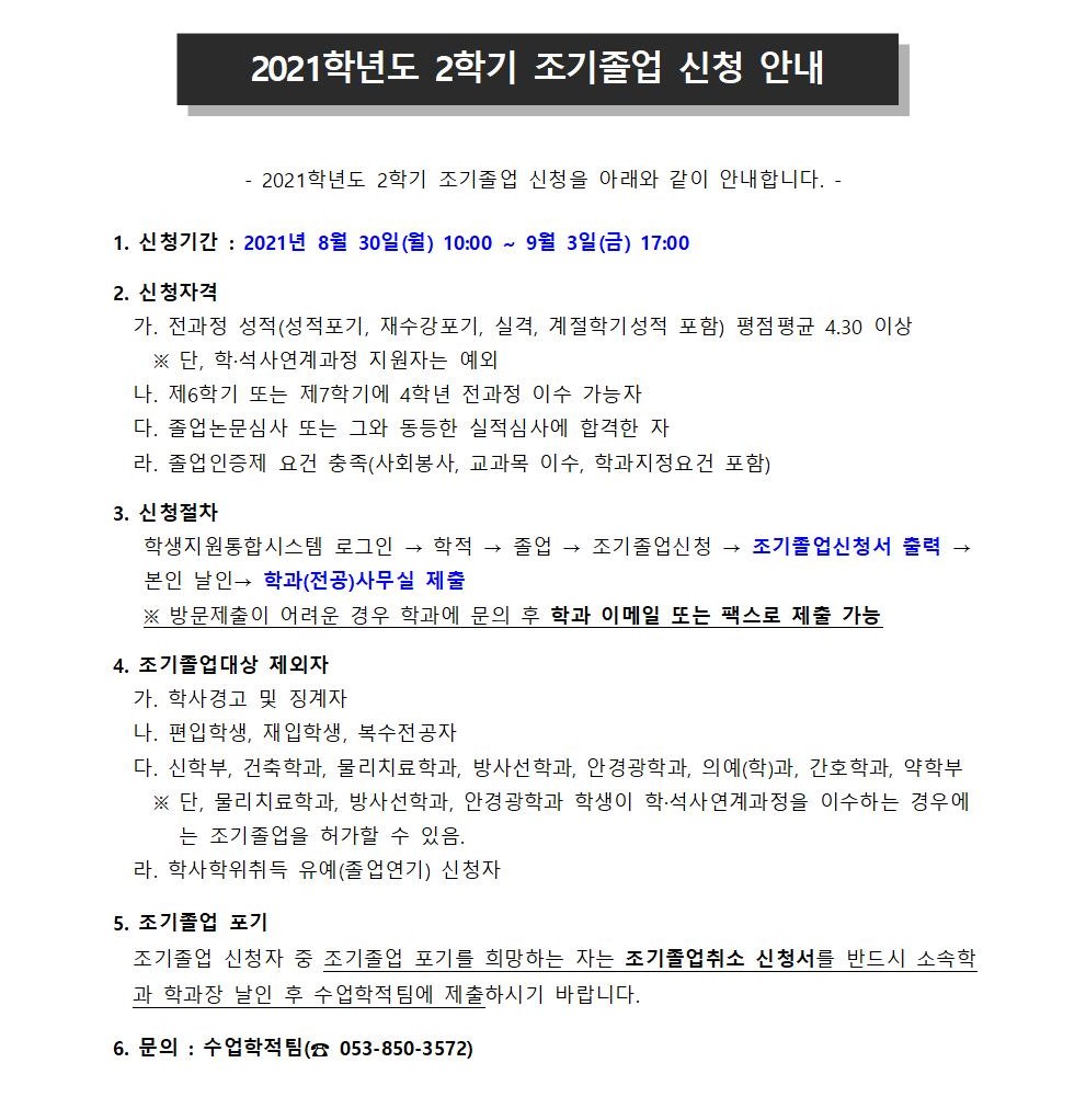 2021학년도 2학기 조기졸업 신청 안내