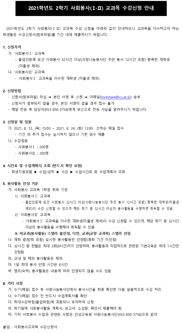 2021학년도 2학기 사회봉사(Ⅰ·Ⅱ) 교과목 수강신청 안내