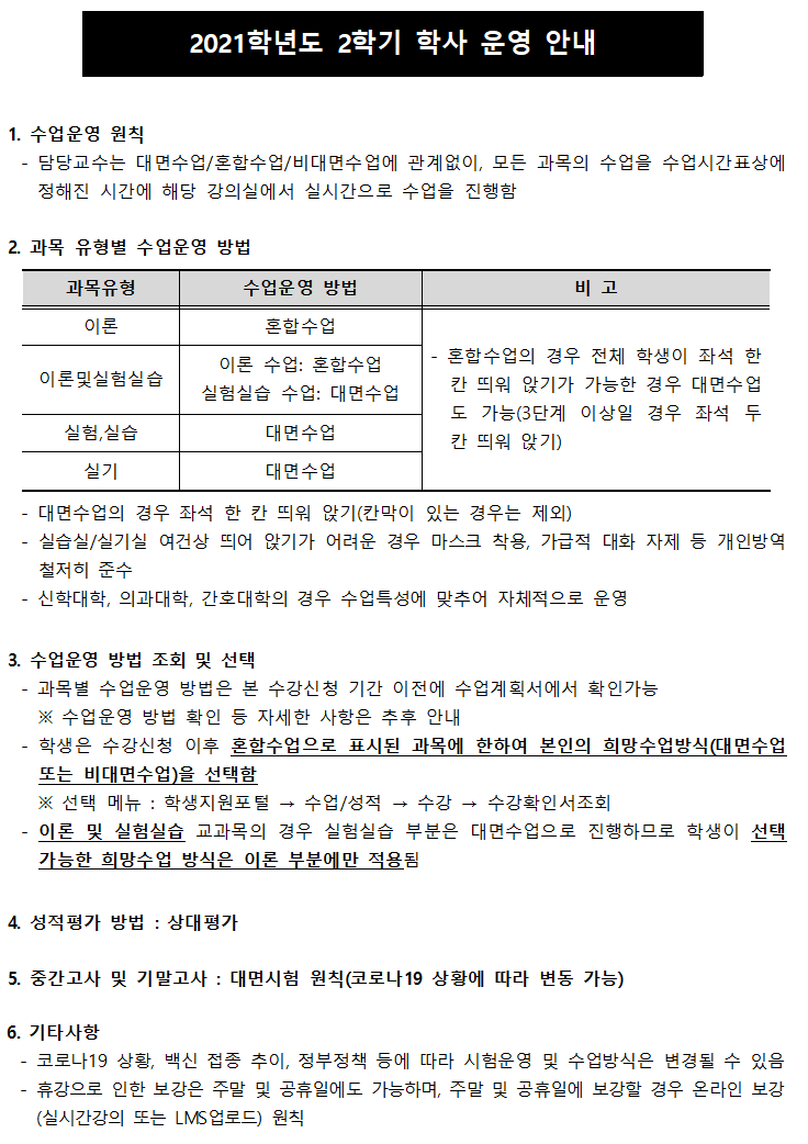 2021학년도 2학기 학사 운영 안내