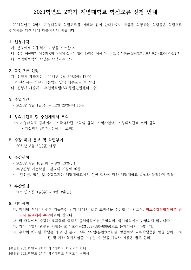 2021학년도 2학기 계명대학교 학점교류 신청 안내